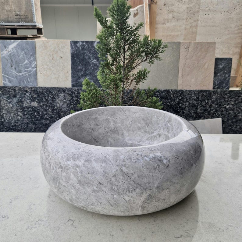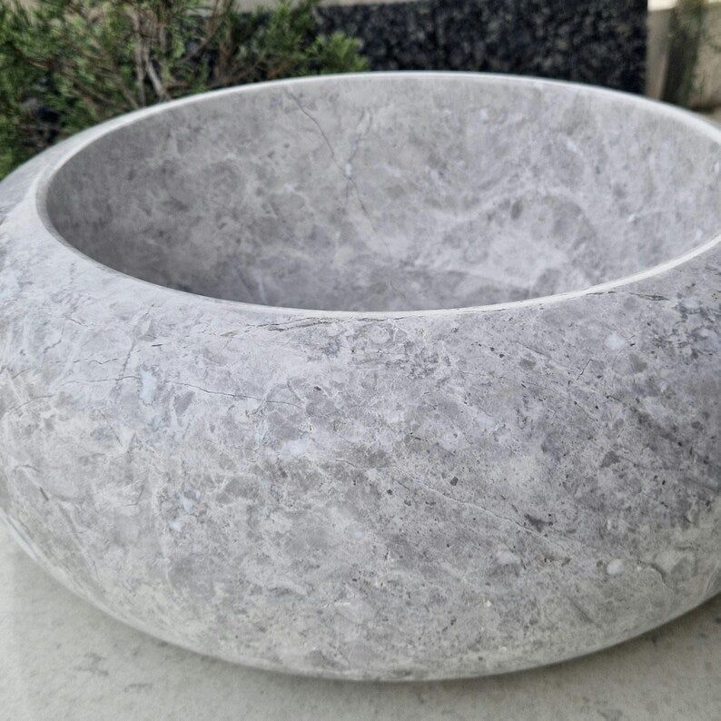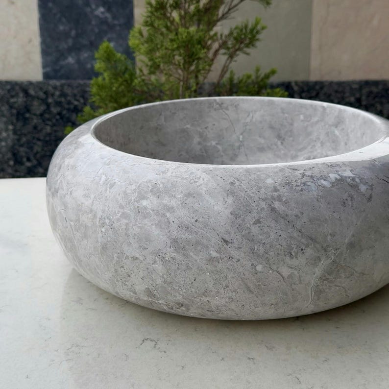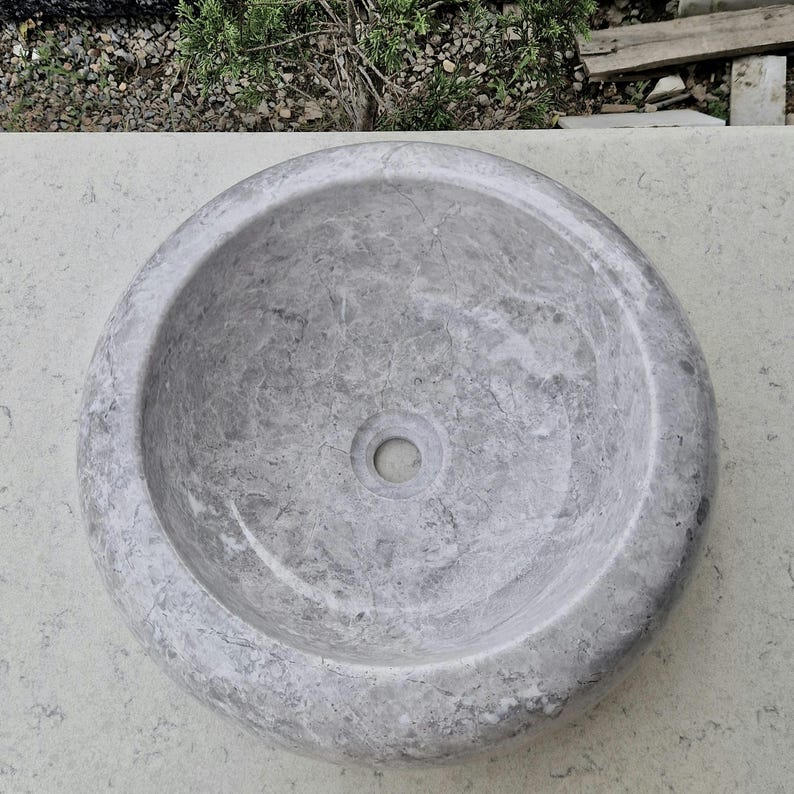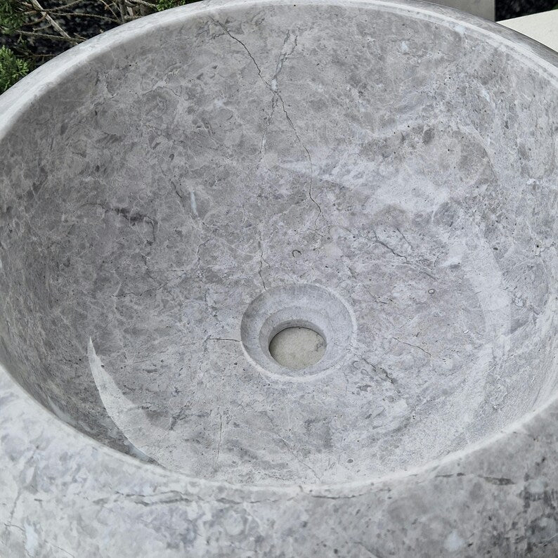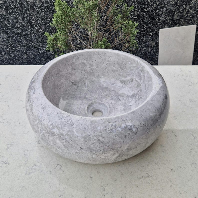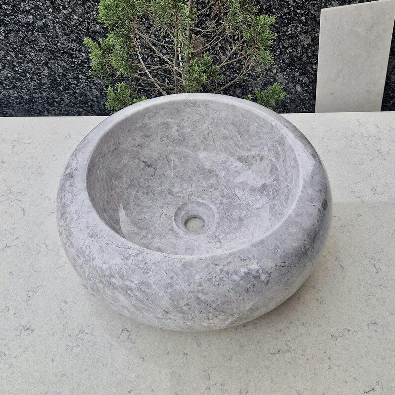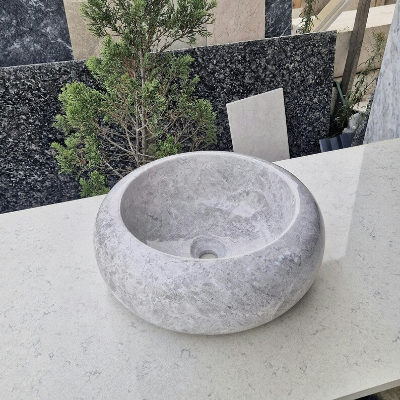 Add elegance to your bathroom with this handcrafted marble sink. This chic round basin showcases the beauty of natural stone, with its soft tones and smooth curves. Each sink is carefully carved by hand, making every piece unique.