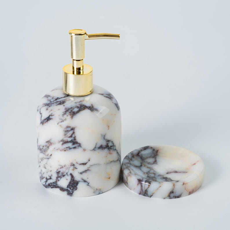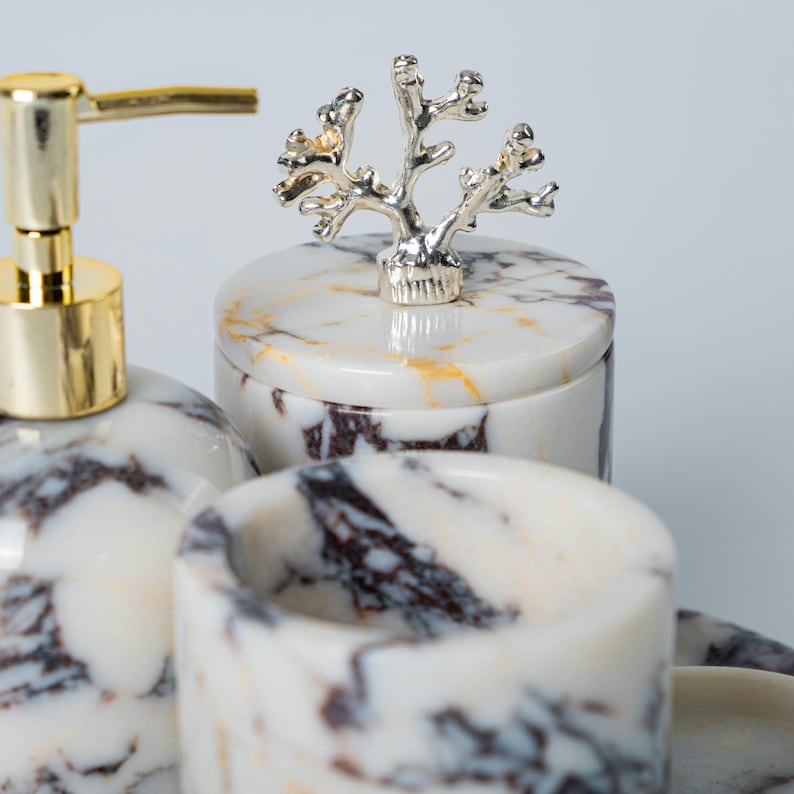 Transform your bathroom into a haven of sophistication with this exquisite handcrafted marble bathroom accessory set. Each piece is carved from high-quality marble, showcasing natural veins that make every set one of a kind. The elegant blend of ivory tones with bold veining creates a timeless and luxurious aesthetic that complements both modern and classic interiors.