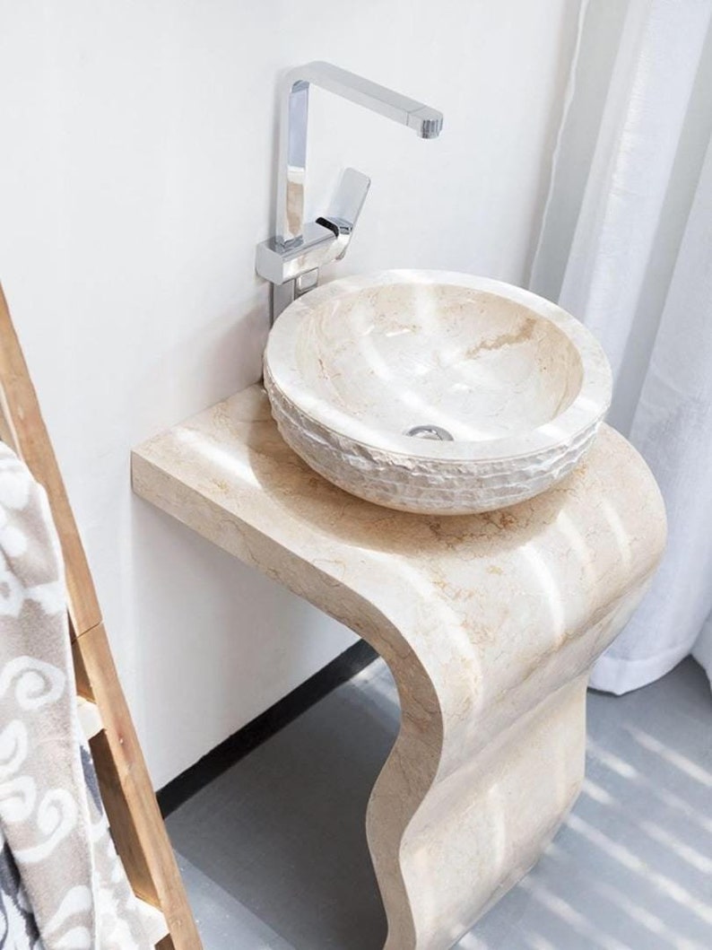 Each sink is meticulously crafted, showcasing the artisan's attention to detail and respect for the natural materials. The smooth, polished bowl rests gracefully on the pedestal, exuding understated luxury and harmony. Its minimalist design makes it a versatile choice, effortlessly enhancing the aesthetic of any bathroom, from compact powder rooms to spacious master ensuites.