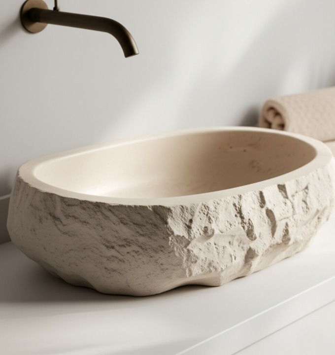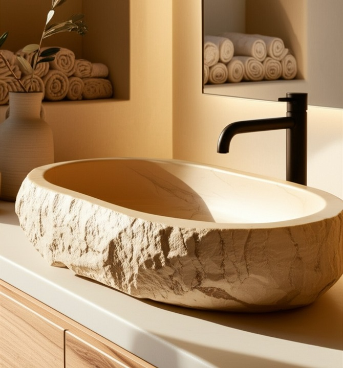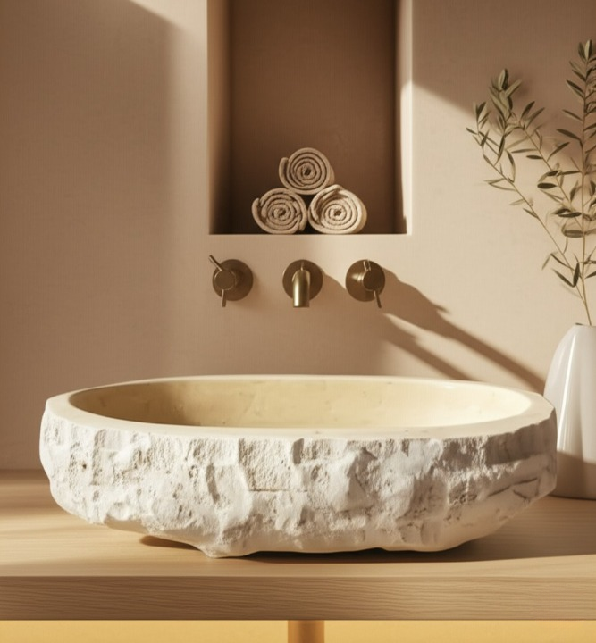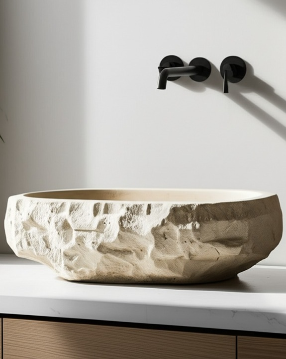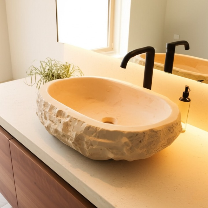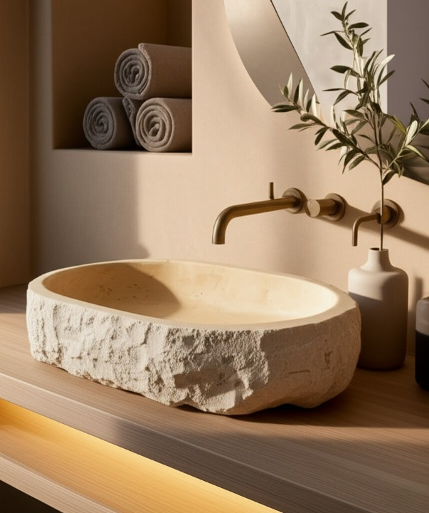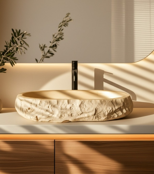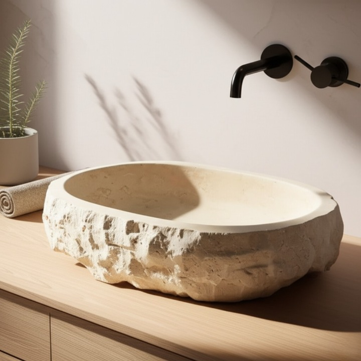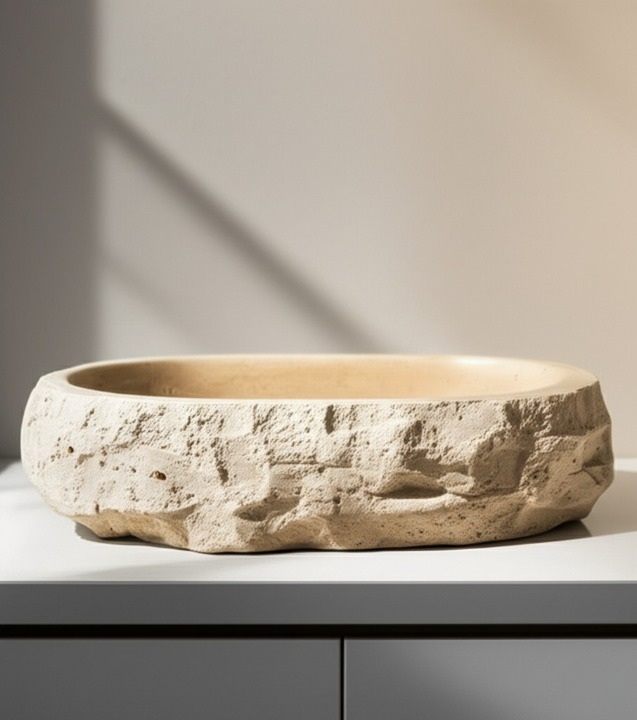 Rustic Oval Travertine Stone Sink – Hand-Carved Bathroom Basin