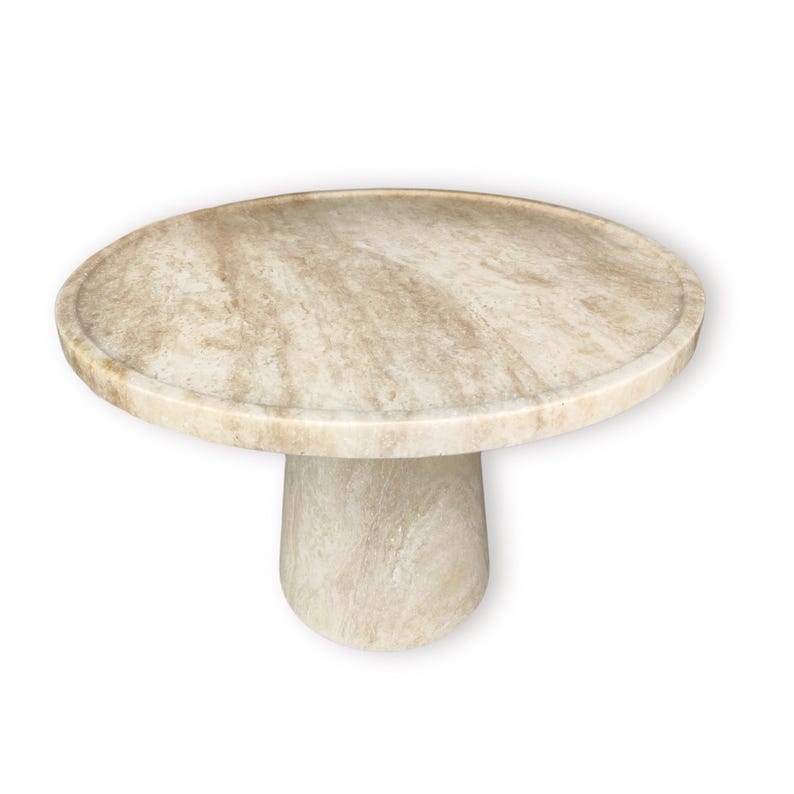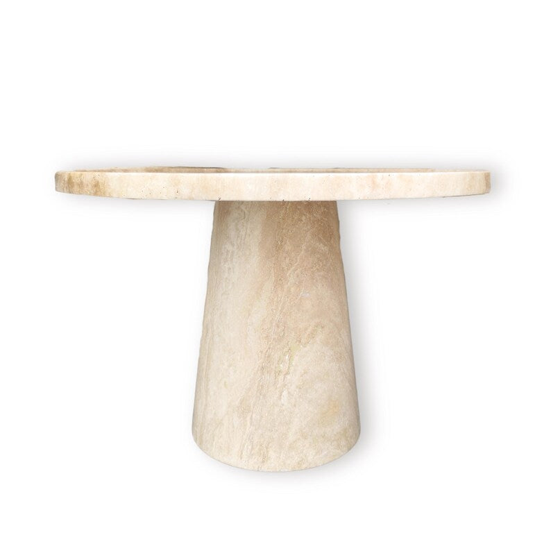 Add a touch of timeless elegance to your space with this stunning handcrafted travertine coffee table. Featuring a round top and a tapered base, this minimalist yet sculptural design beautifully highlights the natural textures and warm tones of travertine stone.